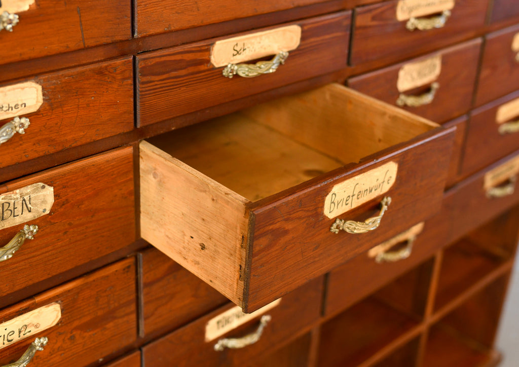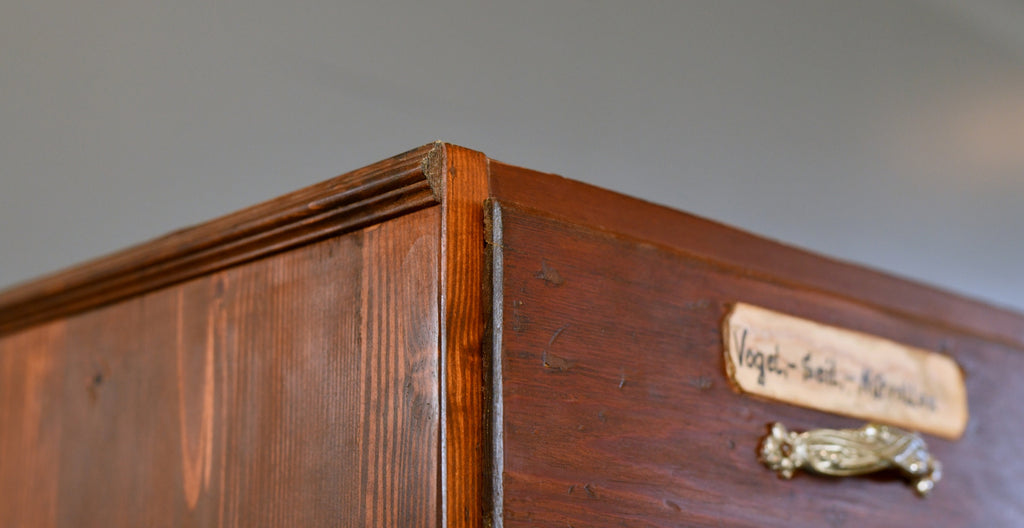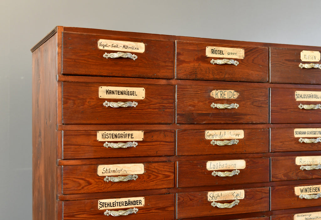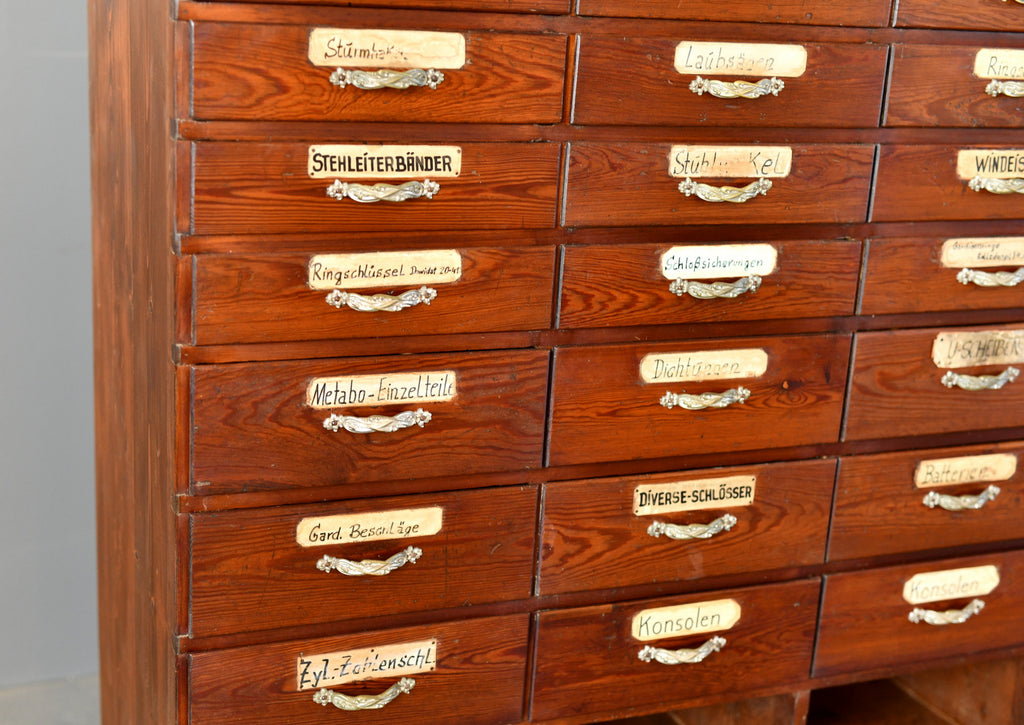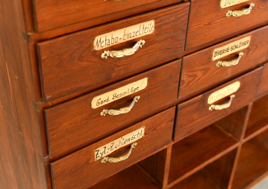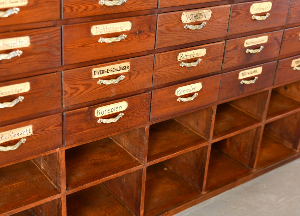 The drawers originally formed part of a large Ironmongers shop and was one of 4 sets of drawers used to store a huge variety of items along the back wall of the shop. Located in the Saarland region of Germany, the shop and full interior was built in 1907 and made by local carpenters using Pine & Larch from the surrounding forests of the southern Mosel valley. Unfortunately the shop closed after over 100 years of business, our team were then tasked with saving and painstakingly dismantling the entire shop interior.