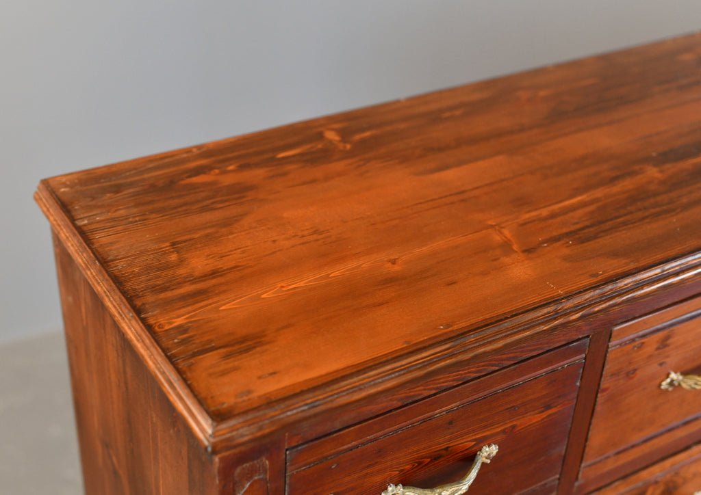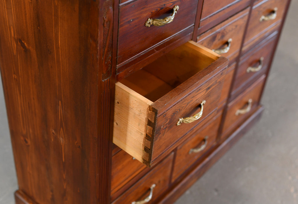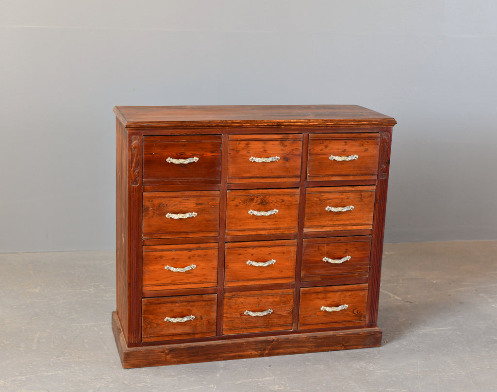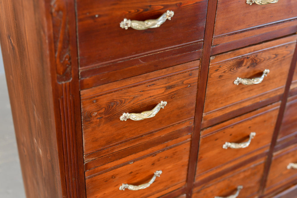 The drawers originally formed part of a large Ironmongers shop and was one of 4 sets of drawers used to store screws and nails. Located in the Saarland region of Germany, the shop and full interior was built in 1907 and made by local carpenters using Pine & Larch from the surrounding forests of the southern Mosel valley. Unfortunately the shop closed after over 100 years of business, our team were then tasked with saving and painstakingly dismantling the entire shop interior.