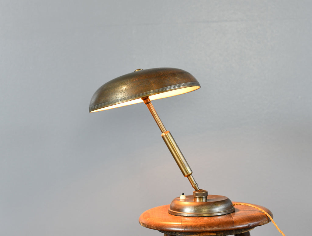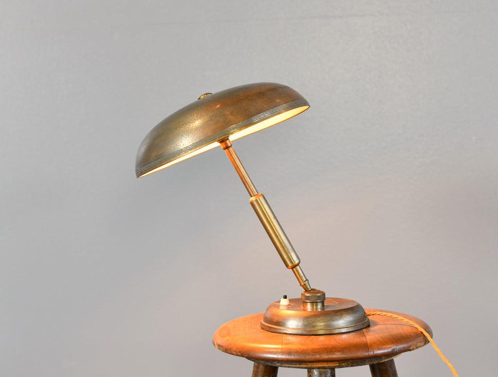 Fully re wired with modern electrical components, some light patina to the brass surface and some dents to the shade