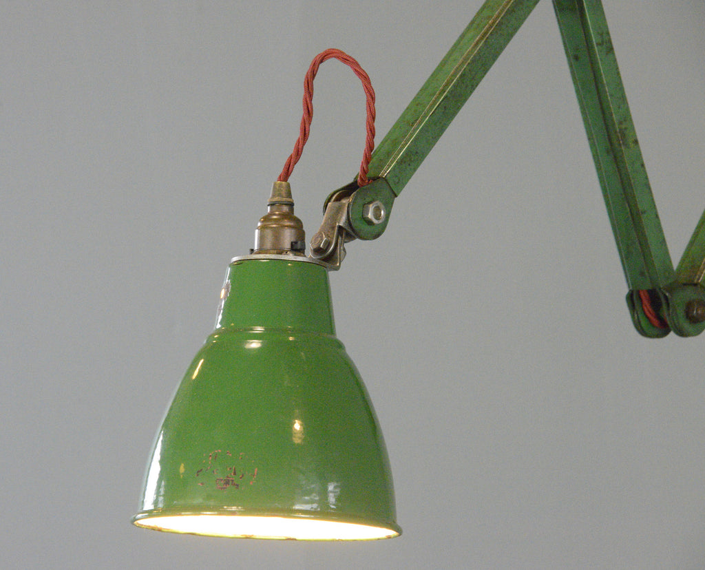 Fully re wired with modern electrical components, some patina and small chips to the enamel at the bottom tip of the inside of the shade