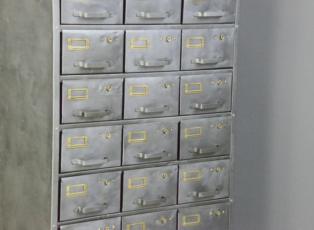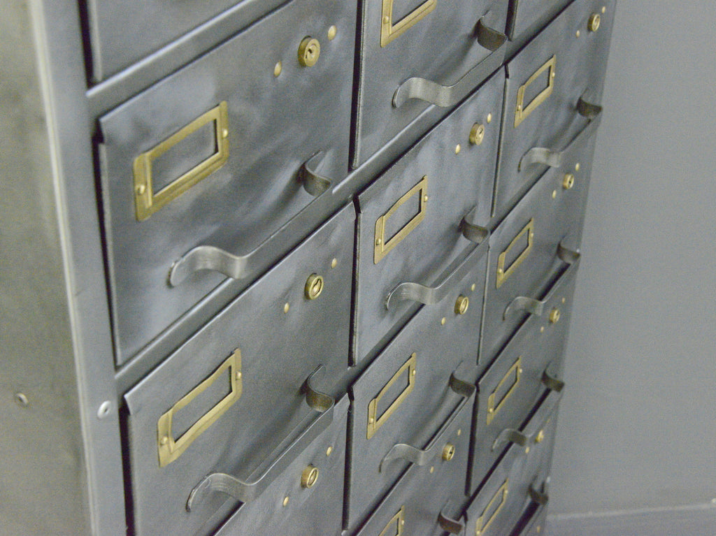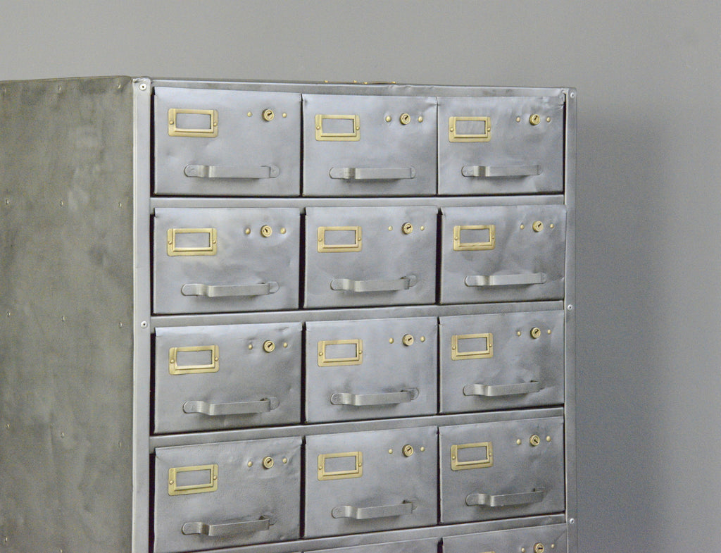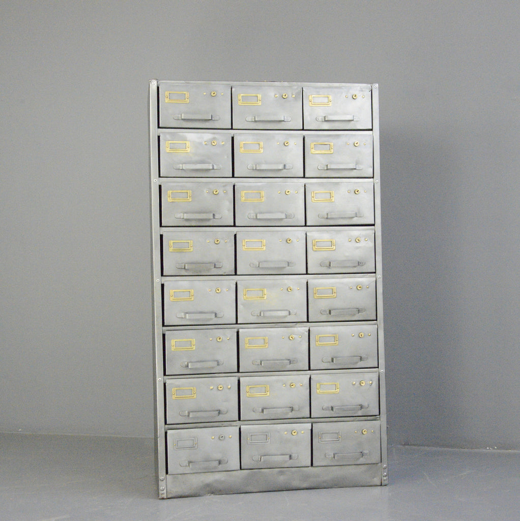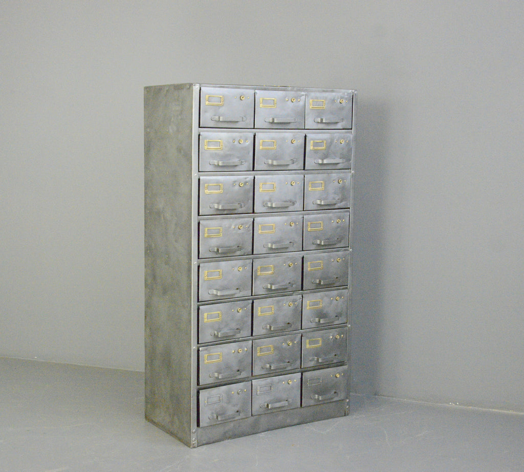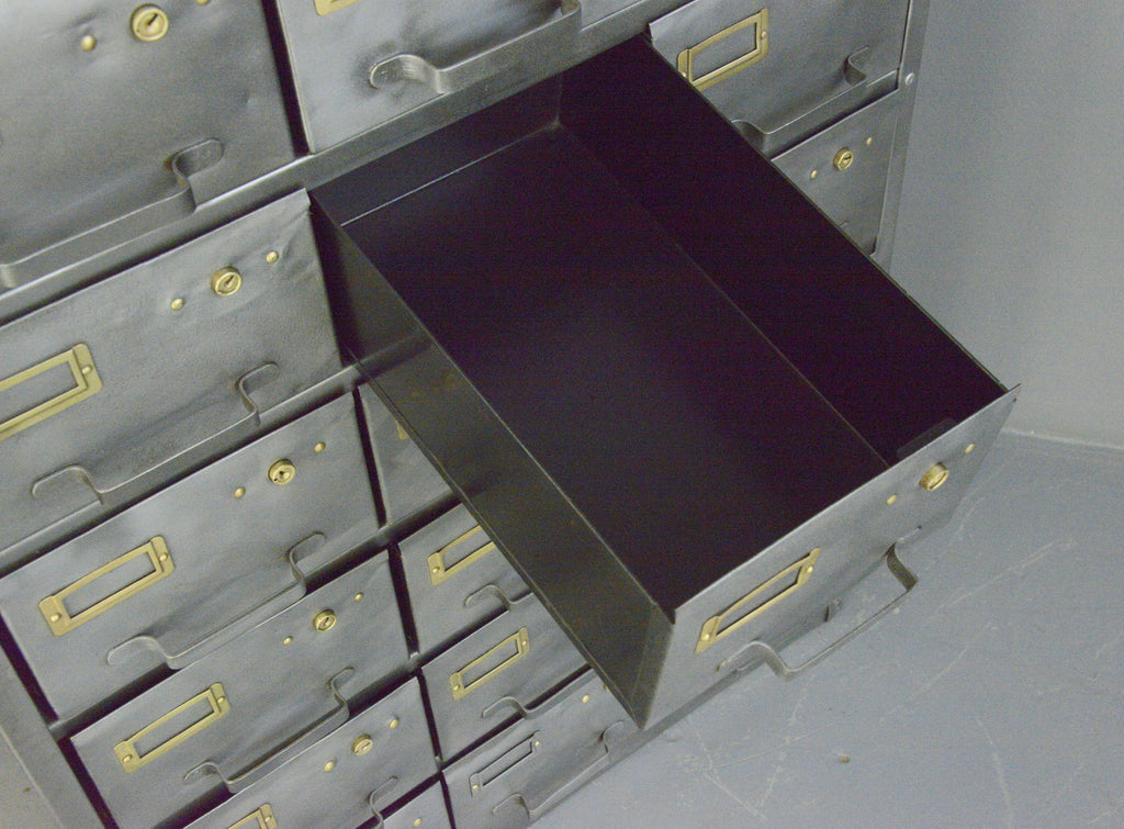 All the drawers run smoothly and the cabinet has been stripped and burnished. The outside has been clear lacquered and inside the drawers have been painted satin black. The cabinet will have some dents and other age related marks.