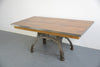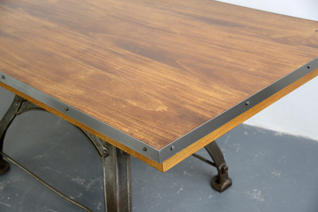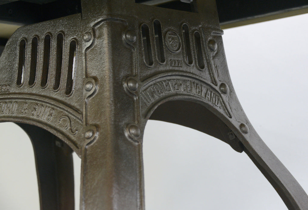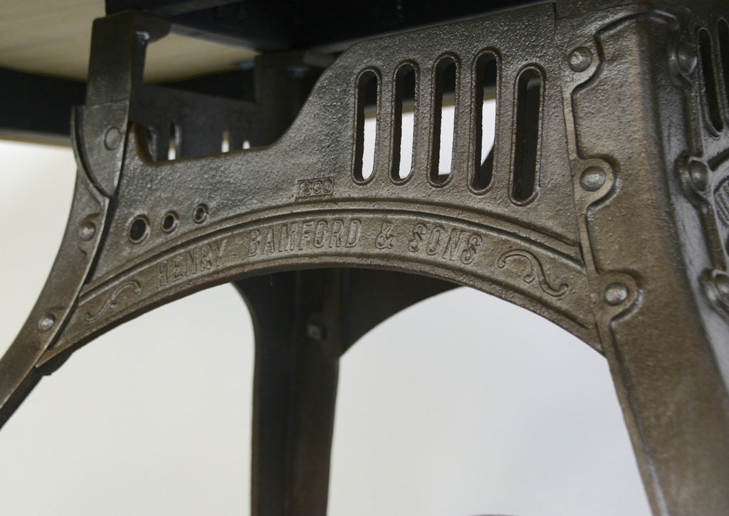 When it comes to making our tables, we start from the bottom up. It begins by sourcing the best quality cast iron bases. We focus on bases from Western Europe and from the period of the late 19th century to the early 20th century. We focus on the shape, style and the quality of the casting; the bases come from a variety of sources, some were used as machine bases from factories and workshops and others for farm equipment. We begin by sandblasting the bases, this removes years of dirt, grease and very often many bad paint jobs! We then burnish them, this removes any remaining paint and smooths any coarseness from the sandblasting process. After a good dust and clean the bases are given several coats of clear lacquer, - for this we use an acrylic lacquer, the same type used in the manufacturing and restoration of cars.