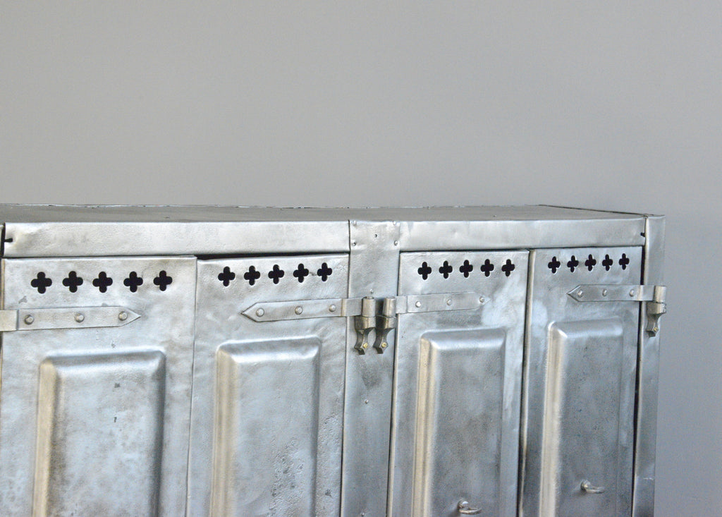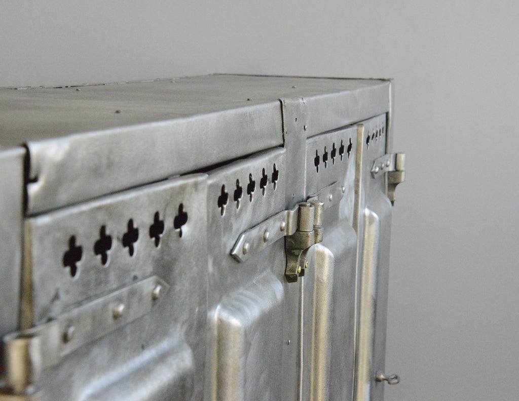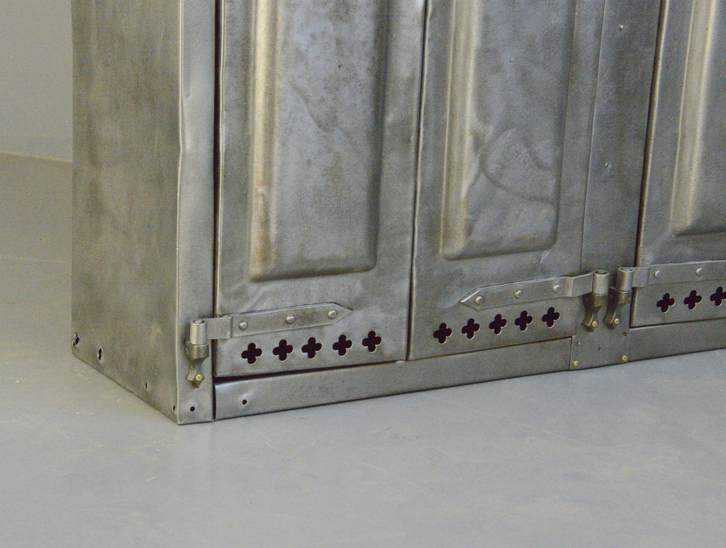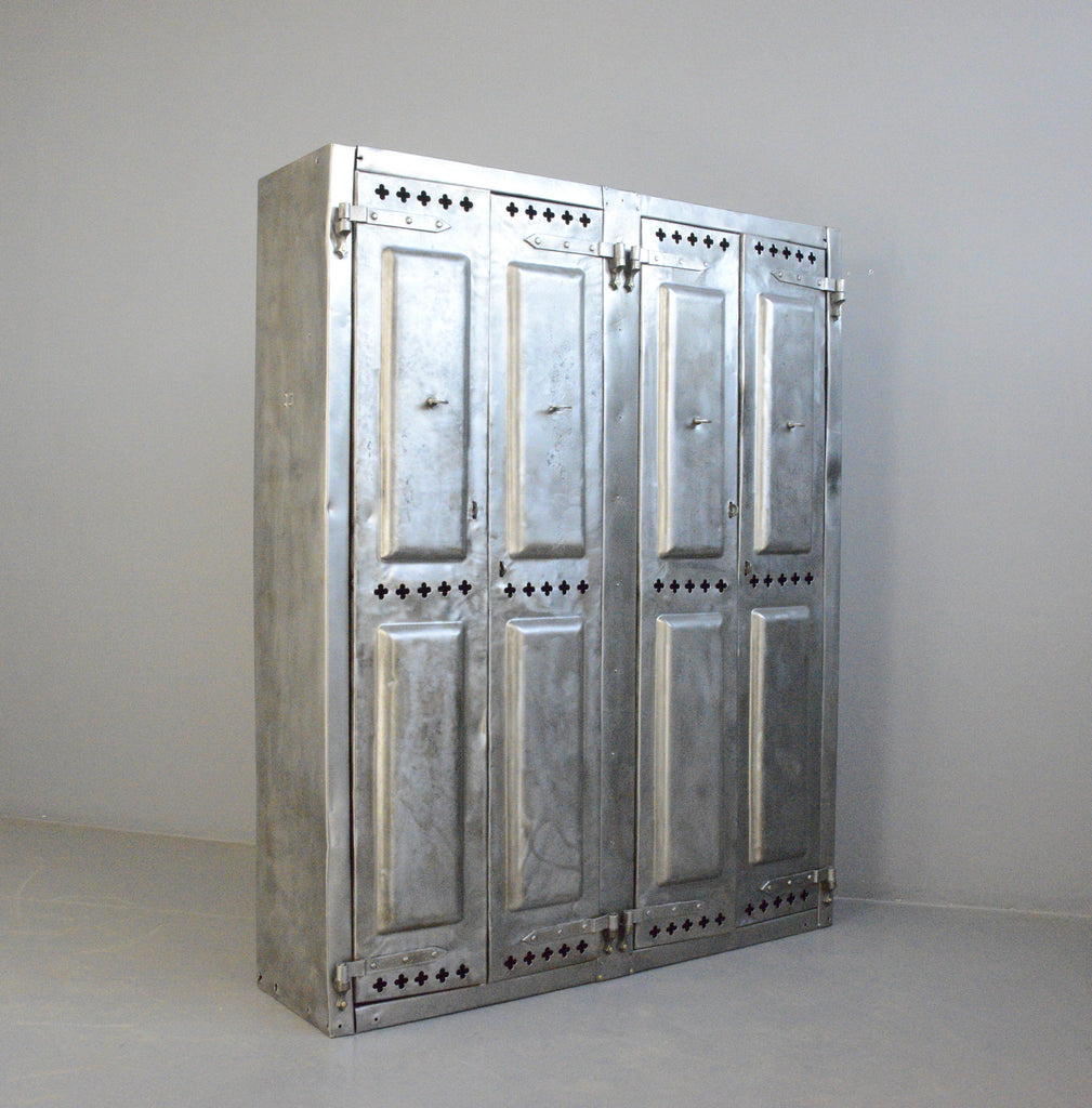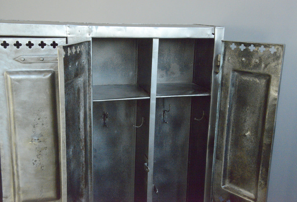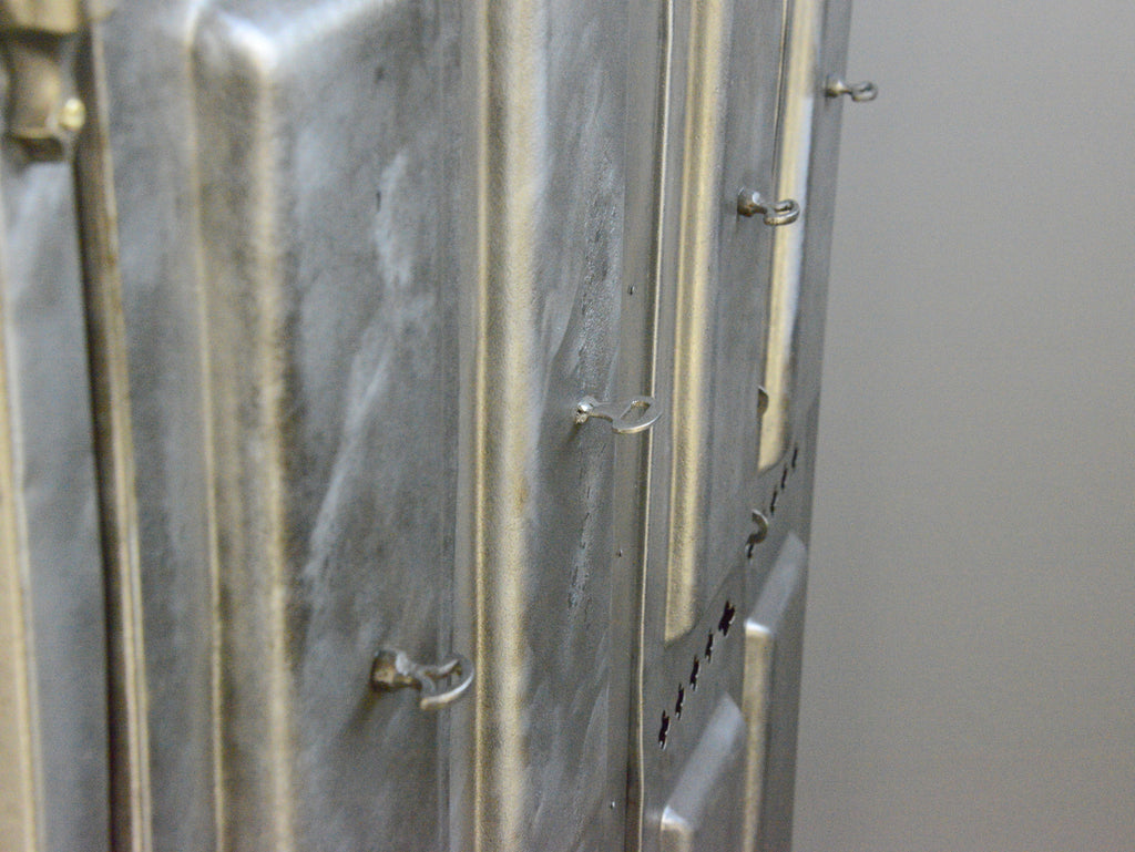 All doors open and latch smoothly and the unit has been sandblasted inside and out and clear lacquered. The lockers will show signs of wear in the form of dents, warping and some repairs including one replacement handle.
