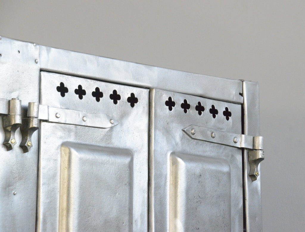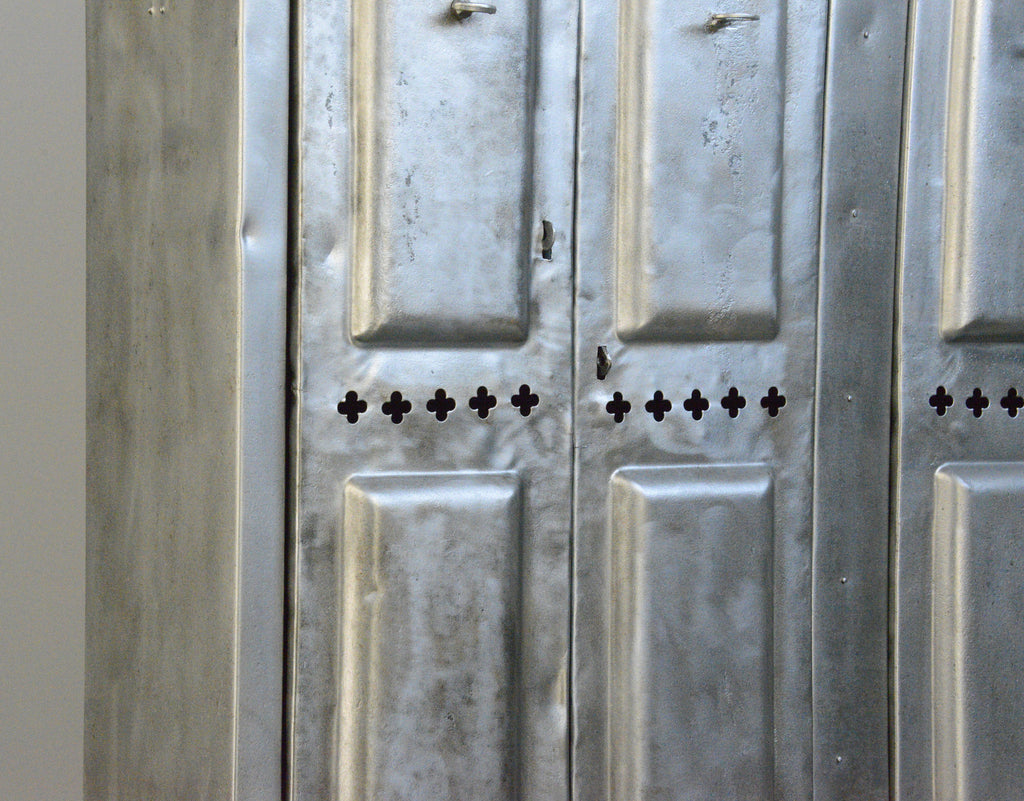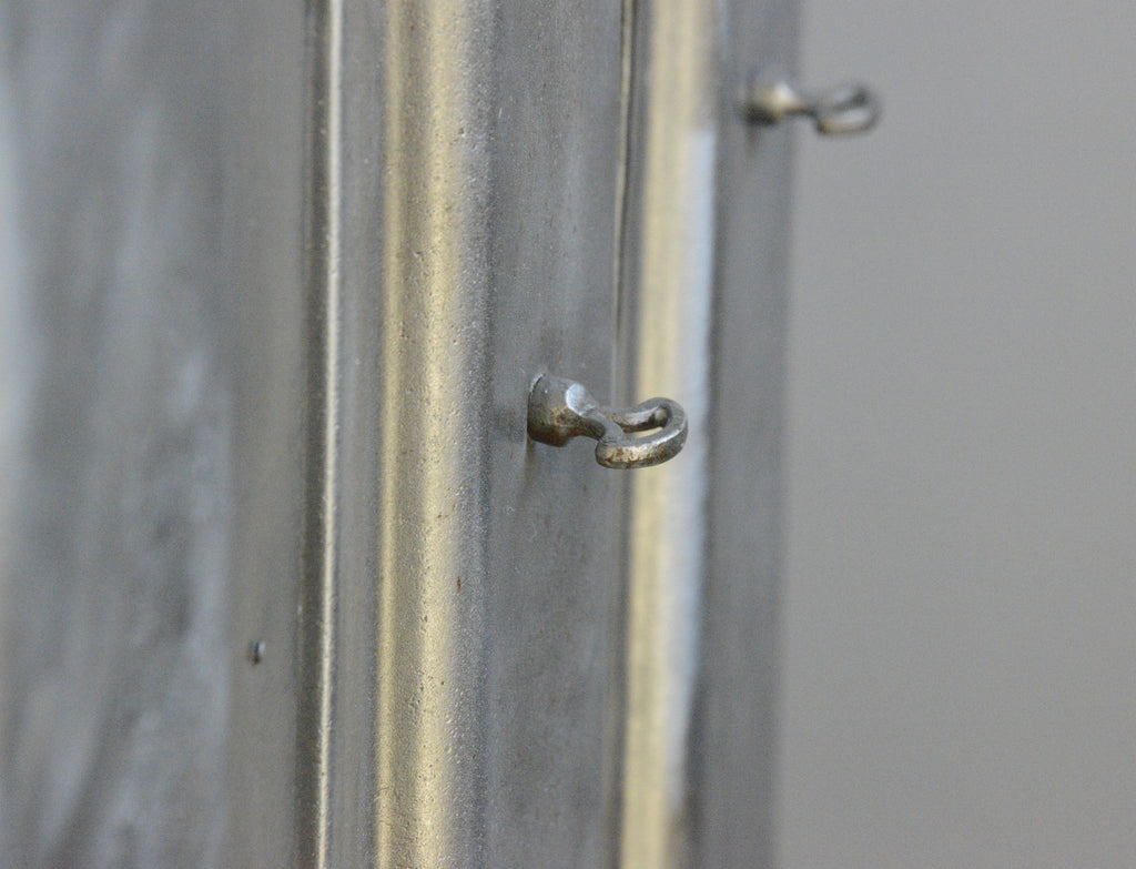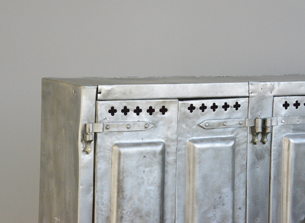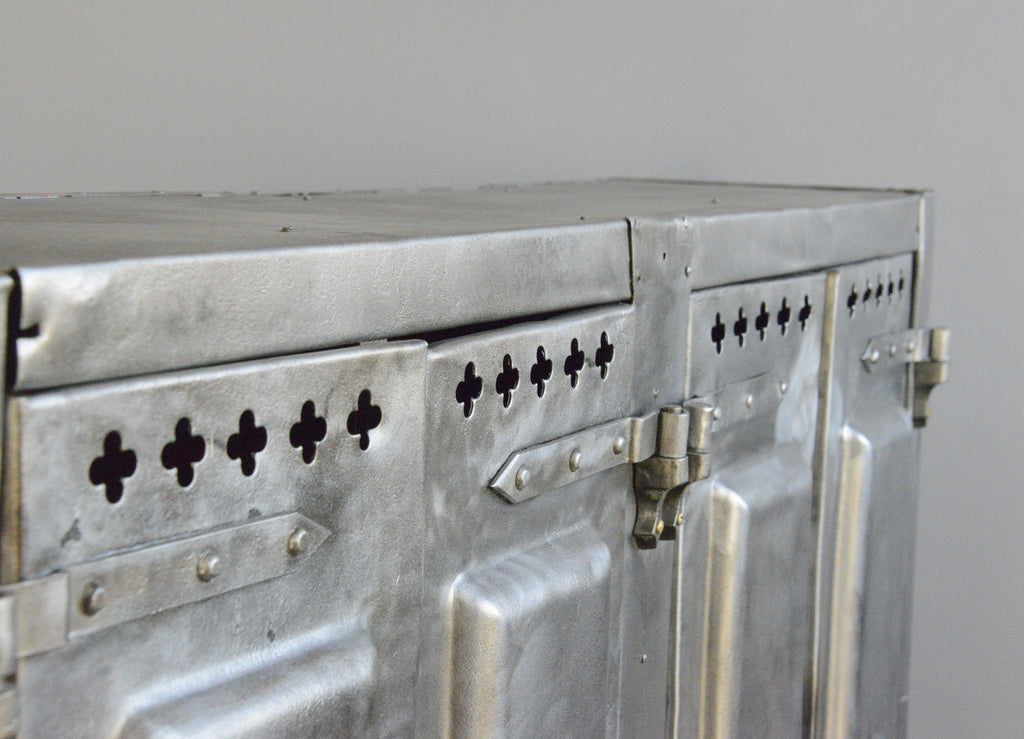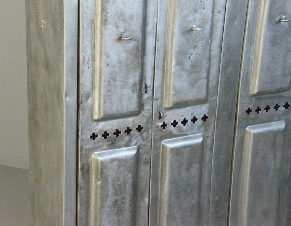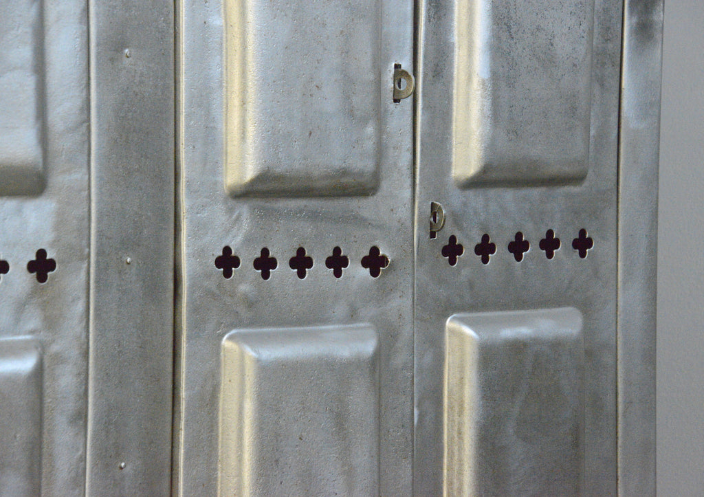 All doors open and latch smoothly and the unit has been sandblasted inside and out and clear lacquered. The lockers will show signs of wear in the form of dents, warping and some repairs including one replacement handle.