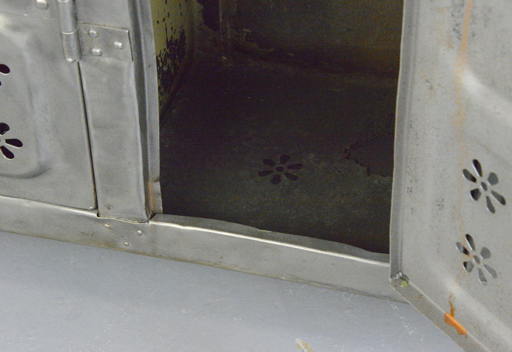 Sandblasted and clear lacquered, all doors open and close smoothly. Some dents and wear in various places, one of the floors of one of the compartments has had a repair.