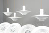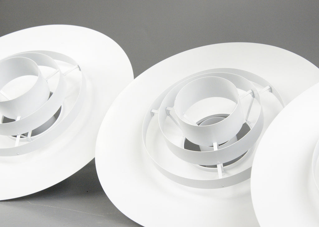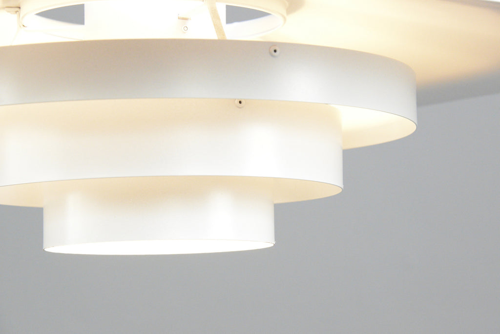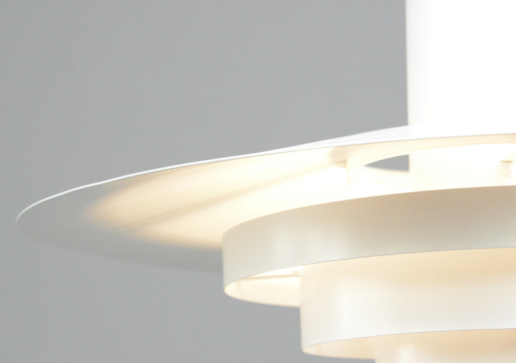 After the war—especially in the 1960s and ’70s—Fog & Mørup’s international reputation reached new heights. In 1959, Johannes (Jo) Hammerborg(1920-1982) joined as head of design and introduced modernist design principles to the Fog & Mørup collections. Streamlined, sleek forms become the company’s signature aesthetic, which was expressed in a range of lamps, pendants, and sconces designed by Hammerborg and other outside designers, like Jørgen Bo, Sophus Frandsen, and Torsten Thorup. Standout designs include the Semi Pendant by Thorup and Claus Bonderup (1967); the Falcon Pendant by Andreas Hansen (1967); and the Nova Pendant (1963), Trombone Lamp (ca. 1966), and Copper Kastor collection (ca. 1969-71) by Hammerborg.