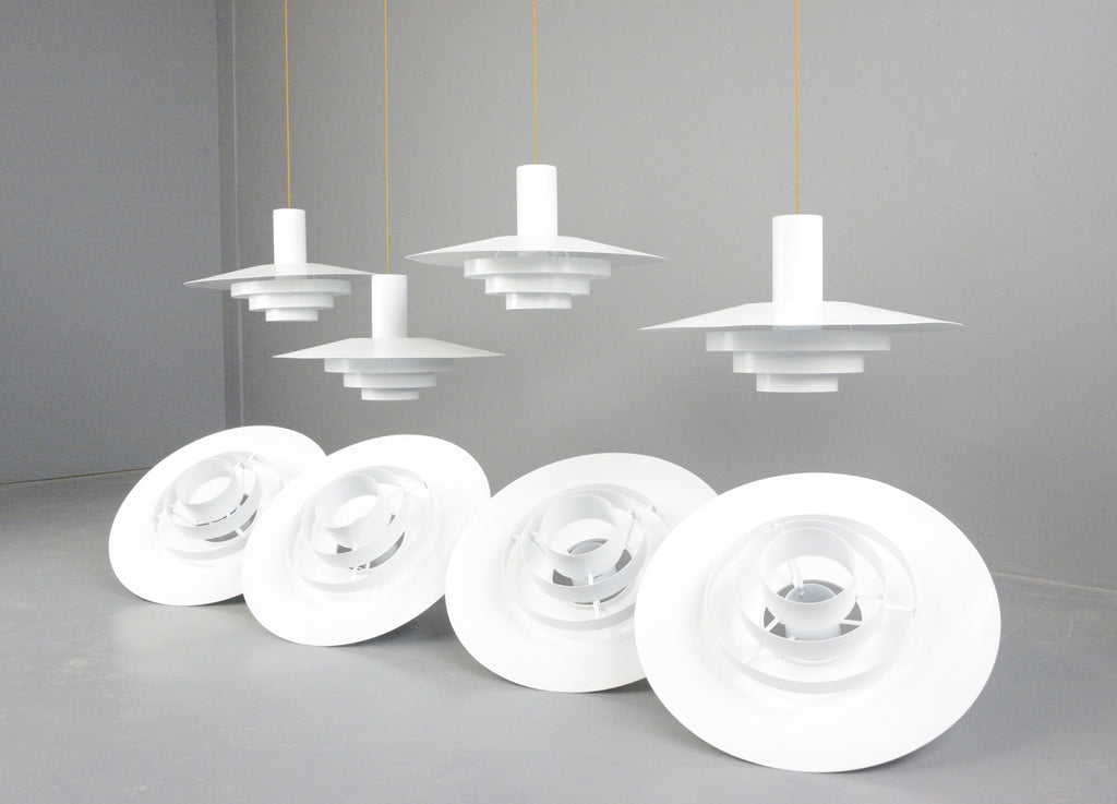 Fully re wired with modern electrical components, each shade has been re sprayed white. Each shade will show some king of wear in the form of mishaping, dents and some slight waring to the shades.