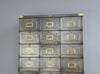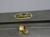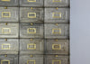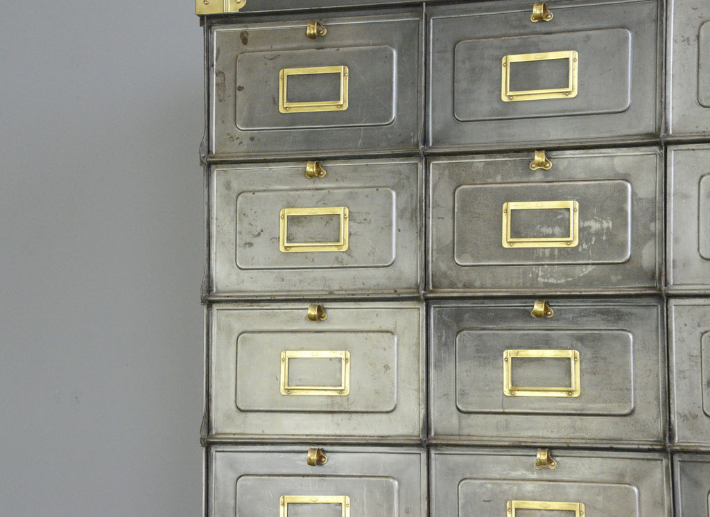 The cabinet has been striped inside and out, the inside of each compartment has been cleaned and coated with satin black paint. The outside has been lightly brushed and given several coats of clear lacquer. There are some dents and age marks in places and a couple of handles have some slight mishaping, all on the compartments open and close smoothly.