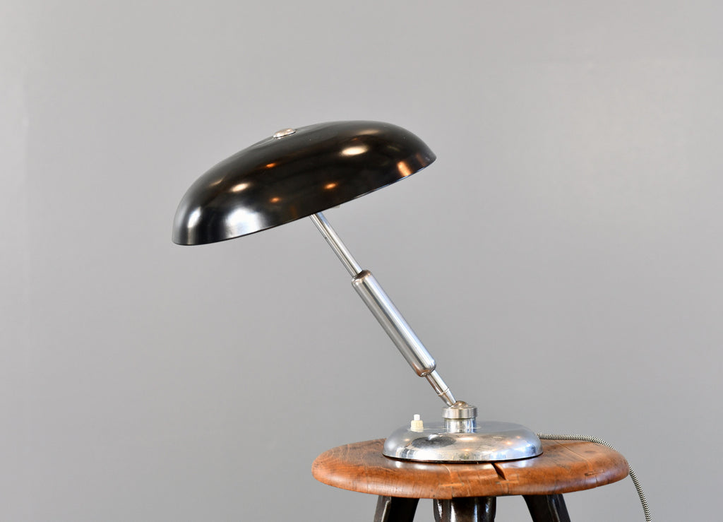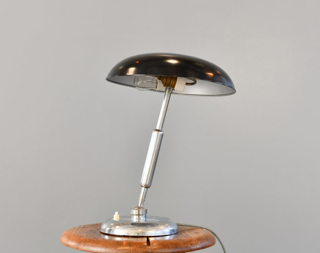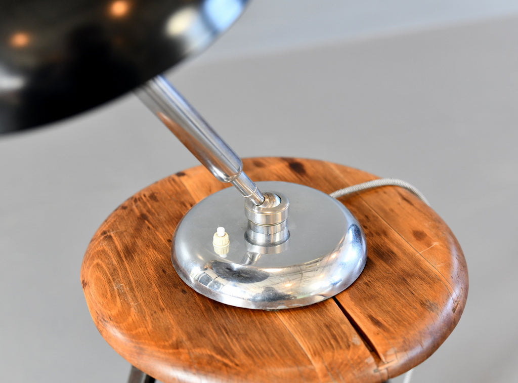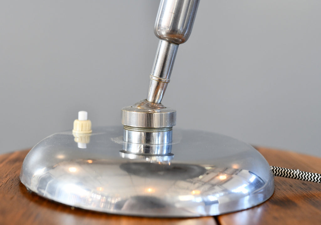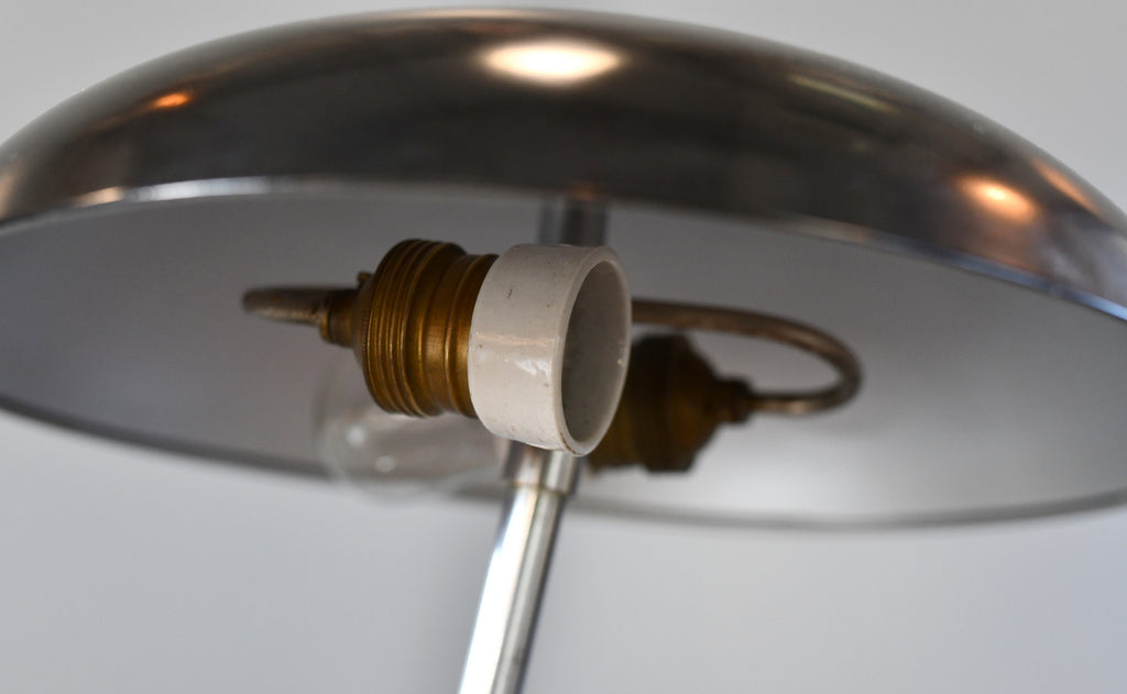 Fully re wired with modern electrical components, some patina to the chrome surface and some dents to the shade